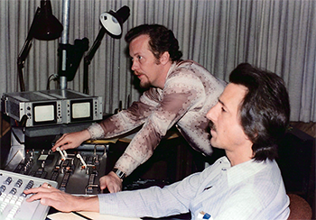 David asked Travis to co-produce and direct a long-form Ventures music video celebrating the 25th anniversary of America's Space Program for Award Records and Tapes. Together they studied NASA footage, budgeted and filmed the one day shoot at Conway Recording Studios in Hollywood. David sat in at the editing session at the video editing facility in Burbank, California, where Travis artfully cut together the fan-favorite shot of Mel, set up by cinematographer Harry Mathias when he shot Mel playing a fill from beneath his floor tom, that Travis intercut with a shot of a NASA booster rocket separation. |