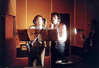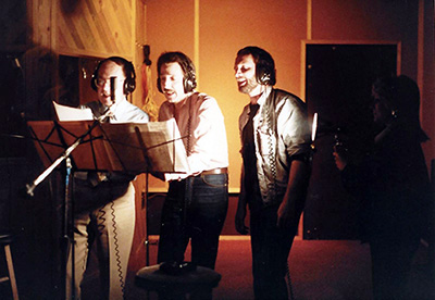 Born and educated in England, David Carr told me that arranging and conducting the orchestra for my World Premiere Benefit Performance of Grumpuss for the Save the Children Fund at Blenheim Palace, a World Heritage site, birthplace of Sir Winston Churchill, and home to the Dukes of Marlborough, was the fulfillment of a long-imagined homecoming dream, and a highlight of his musical career. David was in the original UK line-up of the Fortunes best remembered for their hit recordings of “You’ve Got Your Troubles” (Decca, 1965) and “Here Comes That Rainy Day Feeling” (Capitol Records, 1971), after which, David stayed on in Hollywood, as a session musician, frequently working with The Ventures and Kim Fowley. The photo (left), taken at the Grumpuss Banquet after the performance, was David’s favorite. Below, left to right, Colin Sheen, one of the top musician contractors in the UK, US Cinematographer and visual FX supervisor Peter Anderson, David Carr, and Phillip Moores, who before returning to the UK, had worked many US sessions with David, including the demo session with me for the songs from Long-Grin. |