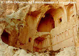 The illusion is that of a ruined building, but it is actually a collapsed sculpture, carved right out of the Cappadocian hillside. It was fast becoming apparent that Trkish locations had much to offer in production value, but what story could unite them? This Macedonian crusader-carved cathedral is historically far more recent than the ancient conflicts of the Hittites and Egyptians, but could be used for a murderous, suspense-filled cat and mouse ambush and chase sequence. |