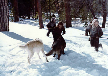 Top: Prepping for the wolf attack. Left to right, director Peter B. Goode, Monty Cox, Don McLeod, Susan Backlinie (with the red bandana), unknown, Adam Pike, Ellen Hibler, Gerard Alcan. Below: "Action!".