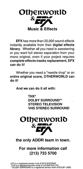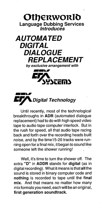 If he was to continue dubbing movies, Travis wanted to make his subsidiary the best in the LA marketplace. He struck a deal with George Johnsen, founder of EFX Systems, but that marketplace was less interested in quality than costs, and greater opportunities arose. The November 21, 1990 Post magazine article on "Otherworld masters of dubbing" reported Travis' prediction that movies would move to discs, and with properly mastered music and effects tracks, different dialogue tracks could be seamlessly substituted by end users. Today, many retail DVDs offer language choices, but there was no DVD in those days, and Travis was talking about theaters offering different language days or hours, based on neighborhood ethnicity. |