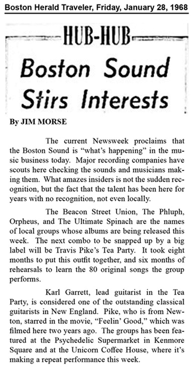 Boston, Massachusetts TRAVIS PIKE'S TEA PARTY PLAYING AT THE PSYCHEDLIC SUPERMARKET AND THE UNICORN COFFEE HOUSE! In early 1968, pundits predicted the Boston Sound would eclipse the San Francisco Sound, but what was the Boston Sound. The most popular sound in dance clubs was Motown, and James Brown and Wilson Pickett were the premiere headliners. Folk was still big in coffeehouses, but apart from Bob Dylan (who had gone electric), folk was no longer considered commercial. The Psychedelic Supermarket in Kenmore Square booked out of town acts by arrangement with their promoters, who sought exposure for their groups in the Boston area. Travis Pike's Tea Party was one of the local exceptions. They played the Supermarket on several occasions, primarily as an opening act for groups like Moby Grape, Spirit and The Fugs. What Travis Pike's Tea Party did, as well any other band in New England, was perform concerts of original music for college, high school, coffee house, art festival crowds and anyone young or old, who actually listened! The Boston Sound was as eclectic and inclusive as the city itself, easily accommodating a myriad of musicians and styles from Pops to Mancini! |